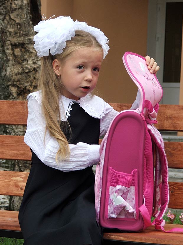 Так вот, 2-го числа примчалась она домой в бантиках-косичках и вся из себя прынцесса-прынцессой. А главное - очень счастливая своим вступлением в новую после детского сада "взрослую" жизнь. Захлебываясь от восторга, тарахтела как трактор Беларусь и день, и вечер, и если бы силком не уложили баиньки, то и ночь.